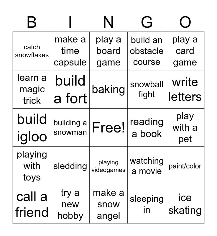 This bingo card has a free space and 29 words: drink hot cocoa, try a new hobby, play a board game, dance party, play a card game, catch snowflakes, build a fort, baking, reading a book, paint/color, call a friend, building a snowman, sleeping in, ice skating, build igloo, do a puzzle, make a snow angel, watching a movie, write letters, playing with toys, sledding, pajama day, snowball fight, play with a pet, learn a magic trick, make a time capsule, playing videogames, build an obstacle course and make snow ice cream.