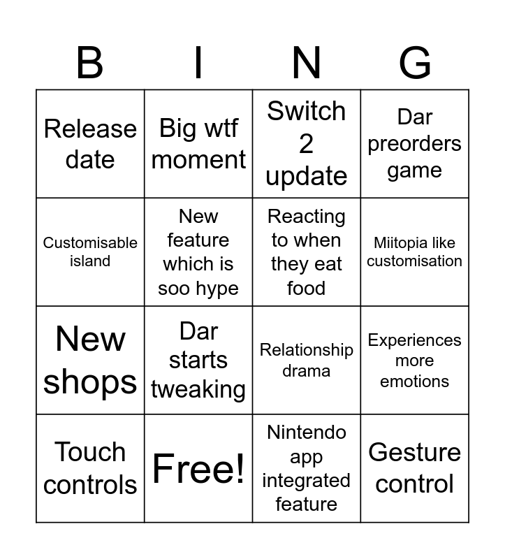 This bingo card has 24 words: Demo release, Gay relationships, Miitopia like customisation, Downloadable miis, Customisable island, Release date, New feature which is soo hype, Big wtf moment, Free!, Pets in the game, New shops, Relationship drama, The miis will be singing, Quirky dance, Reacting to when they eat food, Travel feature?, Nintendo app integrated feature, Switch 2 update, Dar starts tweaking, Experiences more emotions, Touch controls, Gesture control, Dar preorders game and Announce DLC.