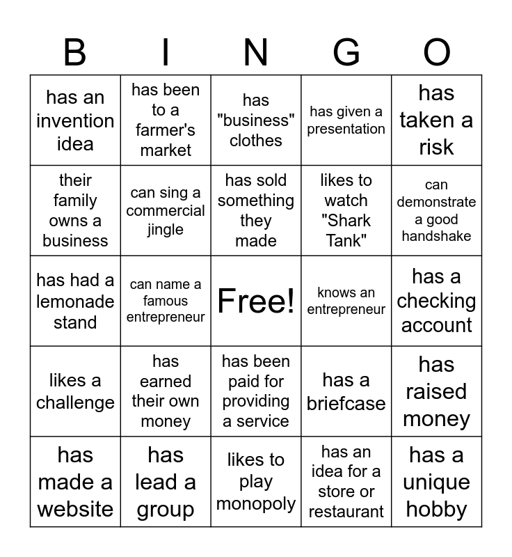 This bingo card has a free space and 24 words: has earned their own money, has lead a group, has sold something they made, has made a website, has taken a risk, has an invention idea, their family owns a business, has been to a farmer's market, knows an entrepreneur, has been paid for providing a service, likes to watch "Shark Tank", has had a lemonade stand, has a briefcase, has raised money, can sing a commercial jingle, has an idea for a store or restaurant, has a checking account, has "business" clothes, can demonstrate a good handshake, can name a famous entrepreneur, has a unique hobby, likes a challenge, has given a presentation and likes to play monopoly.