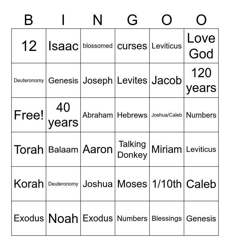 This bingo card has 36 words: Moses, Joshua, Numbers, Deuteronomy, Torah, Hebrews, Genesis, Exodus, Leviticus, 1/10th, 120 years, curses, Caleb, 40 years, Levites, 12, Korah, Joshua/Caleb, Free!, blossomed, Abraham, Balaam, Talking Donkey, Aaron, Miriam, Isaac, Jacob, Noah, Joseph, Love God, Genesis, Exodus, Leviticus, Numbers, Deuteronomy and Blessings.