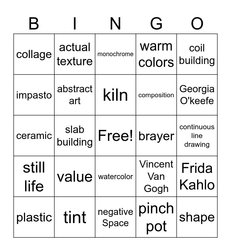 This bingo card has a free space and 52 words: line, shape, Form, negative Space, value, color, actual texture, implied texture, impasto, chiaroscuro, abstract art, animation, Frida Kahlo, Vincent Van Gogh, Starry Night, Leonardo Da Vinci, kiln, brayer, relief print, coil building, slab building, pinch pot, collage, composition, cubism, lithography, geometric shape, organic shape, Georgia O'keefe, realism, mixed media, warm colors, cool colors, neutral colors, complimentary colors, monochrome, tint, tone, shade, screenprint, sketch, continuous line drawing, still life, graffiti, watercolor, acrylic paint, oil paint, ceramic, bone dry, leather hard, plastic and palette.