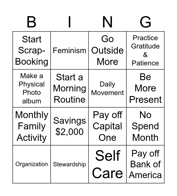 This bingo card has 16 words: Stewardship, No Spend Month, Go Outside More, Start Scrap-Booking, Monthly Family Activity, Feminism, Pay off Capital One, Self Care, Make a Physical Photo album, Start a Morning Routine, Organization, Practice Gratitude & Patience, Savings $2,000, Be More Present, Daily Movement and Pay off Bank of America.