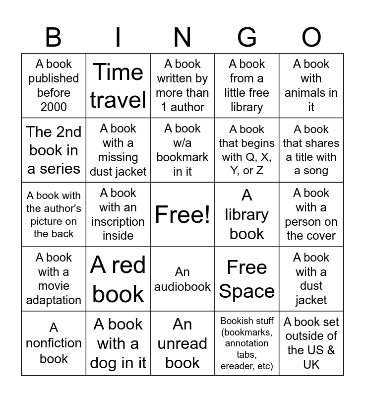 This bingo card has a free space and 25 words: A red book, An unread book, A book w/a bookmark in it, A nonfiction book, A book with animals in it, A book published before 2000, The 2nd book in a series, Time travel, A library book, An audiobook, A book that begins with Q, X, Y, or Z, A book with the author's picture on the back, Free Space, A book with a dust jacket, A book with a missing dust jacket, A paperback and hardback that weigh the same, A book with a person on the cover, A book written by more than 1 author, A book that shares a title with a song, A book with an inscription inside, A book set outside of the US & UK, A book with a dog in it, A book with a movie adaptation, A book from a little free library and Bookish stuff (bookmarks, annotation tabs, ereader, etc).