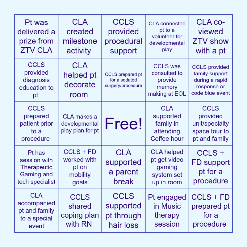 This bingo card has a free space and 34 words: CCLS + FD help pt develop coping strategies for symptom management, Pt engaged in Music therapy session, Pt engaged in art therapy session, Pt engaged in Nature based therapy session, Pt has session with Therapeutic Gaming and tech specialist, CLA helped pt decorate room, CLA co-viewed ZTV show with a pt, CLA accompanied pt and family to a special event, CLA created milestone activity, CCLS worked with pt on medication taking, CCLS prepared pt for a sedated surgery/procedure, CCLS provided procedural support, CCLS engaged pt in medical play, CCLS worked with family to create developmentally supportive schedule, CLA supported family in attending Coffee hour, CCLS provided family support during a rapid response or code blue event, CCLS shared coping plan with RN, CCLS prepared patient prior to a procedure, CCLS + FD worked with pt on mobility goals, CLA helped pt get video gaming system set up in room, CLA supported a parent break, CLA took pt to the End Zone, Pt was delivered a prize from ZTV CLA, CCLS provided unit/specialty space tour to pt and family, CCLS supported pt through hair loss, CCLS + FD prepared pt for a procedure , CLA connected pt to a volunteer for developmental play, CLA brought pt's siblings to the playroom , CCLS was consulted to provide memory making at EOL, CCLS provided diagnosis education to pt , CCLS provided diagnosis education to pt's siblings, CLA makes a developmental play plan for pt, CCLS + FD support pt for a procedure and CCLS + FD engage pt in medical play.
