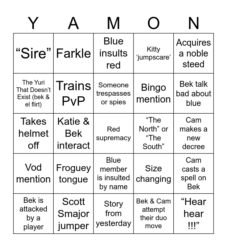 This bingo card has a free space and 24 words: Froguey tongue, Scott Smajor jumper, Someone trespasses or spies, Bek is attacked by a player, Acquires a noble steed, “Sire”, The Yuri That Doesn’t Exist (bek & el flirt), Farkle, “The North” or “The South”, Blue member is insulted by name, Bingo mention, Takes helmet off, Size changing, Cam casts a spell on Bek, Trains PvP, Bek & Cam attempt their duo move, Cam makes a new decree, Blue insults red, Bek talk bad about blue, Katie & Bek interact, “Hear hear !!!”, Vod mention, Kitty ‘jumpscare’ and Story from yesterday.