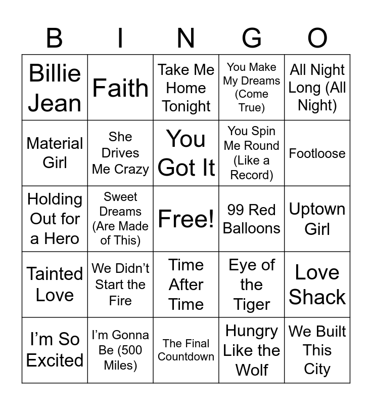 This bingo card has a free space and 72 words: Africa, Faith, Sweet Dreams (Are Made of This), Maneater, Karma Chameleon, Beat It, You Make My Dreams (Come True), Your Love, You Spin Me Round (Like a Record), I Wanna Dance with Somebody, I’m So Excited, It’s Still Rock and Roll to Me, Footloose, Billie Jean, Jump (For My Love), Holding Out for a Hero, Eye of the Tiger, All Night Long (All Night), Don’t Stop Believin’, Uptown Girl, We Didn’t Start the Fire, We Built This City, Love Shack, Hit Me with Your Best Shot, Kiss, Every Breath You Take, Who Can It Be Now?, (I’ve Had) The Time of My Life, Don’t You (Forget About Me), Down Under, I’m Gonna Be (500 Miles), Keep on Loving You, Let’s Dance, Wake Me Up Before You Go-Go, Hungry Like the Wolf, Take On Me, Girls Just Want to Have Fun, You’re My Heart, You’re My Soul, Material Girl, My Prerogative, Time After Time, Never Gonna Give You Up, Walk Like an Egyptian, What I Like About You, Whip It, Tainted Love, Cheri Cheri Lady, Don’t You Want Me, Nothing’s Gonna Stop Us Now, Rock the Casbah, Should I Stay or Should I Go, What a Feeling (Flashdance), Just Like Heaven, 99 Red Balloons, Thriller, Straight Up, Take Me Home Tonight, You Got It, Take My Breath Away, Tell It to My Heart, The Power of Love, Total Eclipse of the Heart, Easy Lover, The Final Countdown, Ghostbusters, Come On Eileen, She Drives Me Crazy, 9 to 5, Dancing in the Dark, I Want to Know What Love Is, Sunglasses at Night and Danger Zone.
