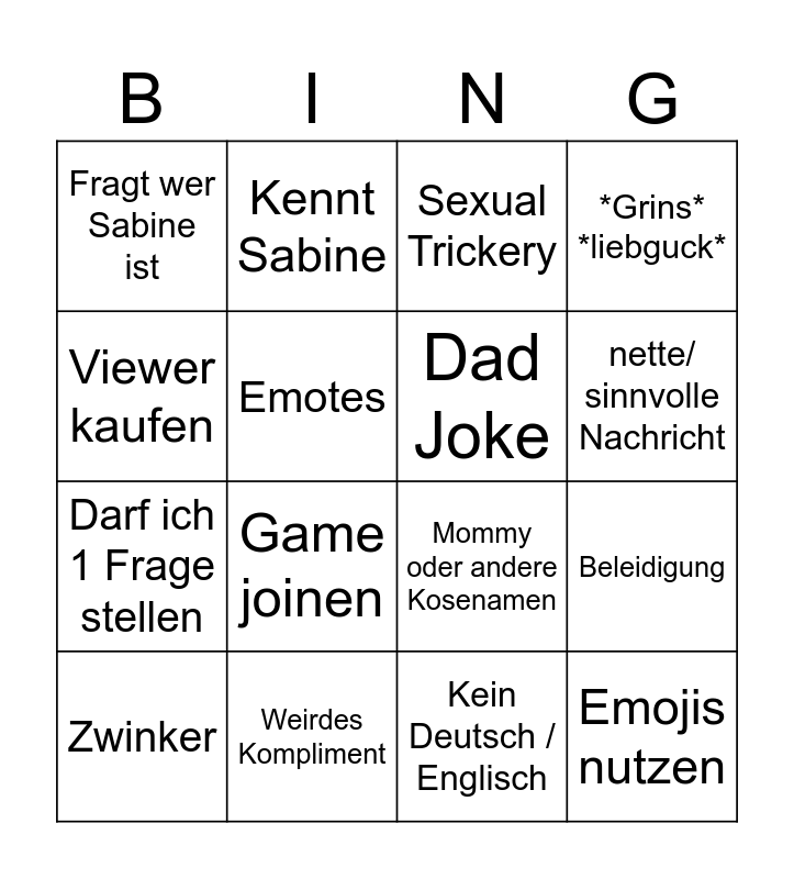 This bingo card has 16 words: Weirdes Kompliment, Beleidigung, Sexual Trickery, Fragt wer Sabine ist, Darf ich 1 Frage stellen, Kennt Sabine, Mommy oder andere Kosenamen, Kein Deutsch / Englisch, Viewer kaufen, Emotes, Zwinker, *Grins* *liebguck*, Game joinen, nette/ sinnvolle Nachricht, Dad Joke and Emojis nutzen.
