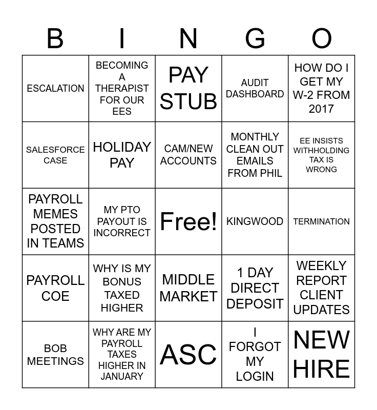 This bingo card has a free space and 30 words: WHY ARE MY PAYROLL TAXES HIGHER IN JANUARY, WHERE IS MY FINAL CHECK, MY PTO PAYOUT IS INCORRECT, WHY AM I GETTING A LIVE CHECK, ESCALATION, PAY STUB, HOLIDAY PAY, MIDDLE MARKET, KINGWOOD, ASC, TERMINATION, NEW HIRE, I FORGOT MY LOGIN, AIMS IS DOWN, EE INSISTS WITHHOLDING TAX IS WRONG, EE ASKS IF WE CAN STOP GARNISHMENT, 1 DAY DIRECT DEPOSIT, PAYROLL COE, WHY IS MY BONUS TAXED HIGHER, HOW DO I GET MY W-2 FROM 2017, PAYROLL MEMES POSTED IN TEAMS, PERFECT PAYROLL WITH ZERO ERRORS, BECOMING A THERAPIST FOR OUR EES, MONTHLY CLEAN OUT EMAILS FROM PHIL, SALESFORCE CASE, AUDIT DASHBOARD, WEEKLY REPORT CLIENT UPDATES, BOB MEETINGS, CAM/NEW ACCOUNTS and CAN I GET MY EES W2S.