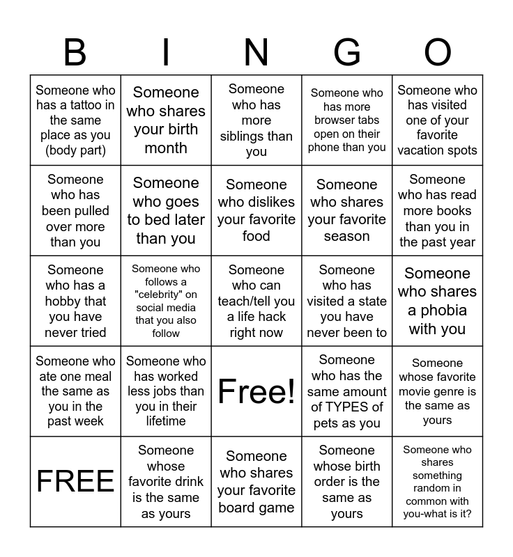 This bingo card has 26 words: Free!, Someone whose birth order is the same as yours, Someone who dislikes your favorite food, Someone whose favorite drink is the same as yours, Someone who has visited one of your favorite vacation spots, Someone who has a tattoo in the same place as you (body part), Someone who has been pulled over more than you, Someone who shares your birth month, Someone who shares a phobia with you, Someone who has the same amount of TYPES of pets as you, Someone who shares your favorite season, Someone who has a hobby that you have never tried, Someone whose favorite movie genre is the same as yours, FREE, Someone who follows a "celebrity" on social media that you also follow, Someone who shares your favorite pizza topping, Someone who has more browser tabs open on their phone than you, Someone who ate one meal the same as you in the past week, Someone who has more siblings than you, Someone who can teach/tell you a life hack right now, Someone who has read more books than you in the past year, Someone who shares your favorite board game, Someone who has visited a state you have never been to, Someone who has worked less jobs than you in their lifetime, Someone who goes to bed later than you and Someone who shares something random in common with you-what is it?.