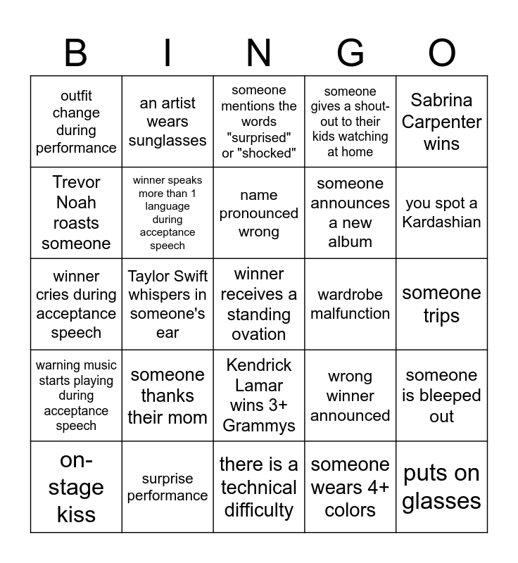 This bingo card has 25 words: someone thanks their mom, there is a technical difficulty, name pronounced wrong, on-stage kiss, Sabrina Carpenter wins, outfit change during performance, Trevor Noah roasts someone, an artist wears sunglasses, wardrobe malfunction, Kendrick Lamar wins 3+ Grammys, someone announces a new album, winner cries during acceptance speech, wrong winner announced, someone is bleeped out, winner speaks more than 1 language during acceptance speech, puts on glasses, someone trips, someone mentions the words "surprised" or "shocked", you spot a Kardashian, Taylor Swift whispers in someone's ear, winner receives a standing ovation, surprise performance, warning music starts playing during acceptance speech, someone gives a shout-out to their kids watching at home and someone wears 4+ colors.
