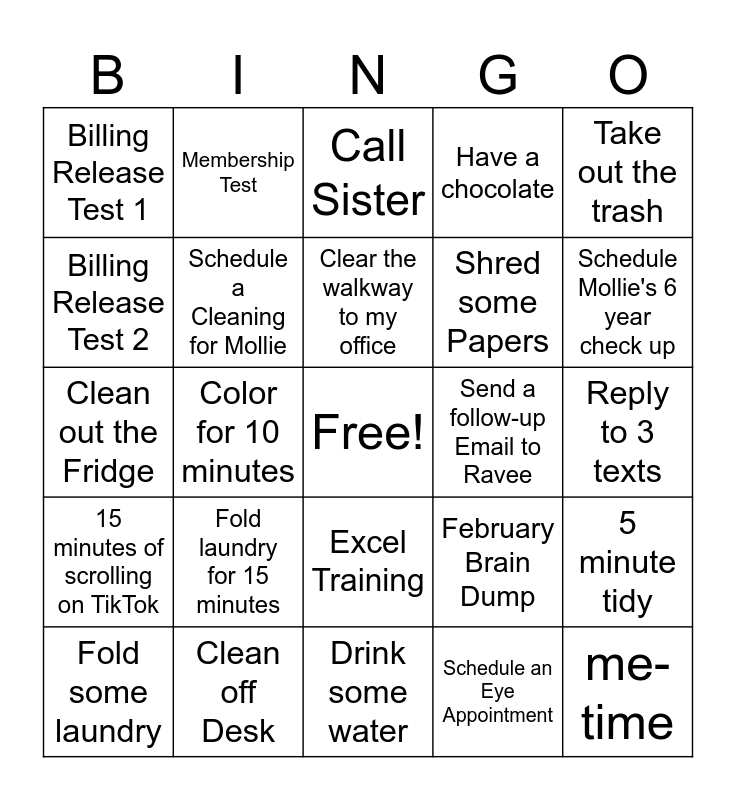 This bingo card has a free space and 24 words: Fold laundry for 15 minutes, Clean off Desk, Clear the walkway to my office, Fold some laundry, Take out the trash, Billing Release Test 1, Billing Release Test 2, Membership Test, Send a follow-up Email to Ravee, Excel Training, Shred some Papers, Clean out the Fridge, February Brain Dump, 5 minute tidy, Schedule a Cleaning for Mollie, Schedule an Eye Appointment, Reply to 3 texts, Call Sister, Schedule Mollie's 6 year check up, Color for 10 minutes, me-time, 15 minutes of scrolling on TikTok, Have a chocolate and Drink some water.