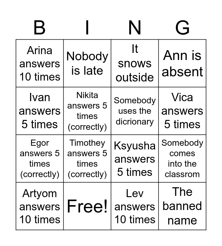 This bingo card has 17 words: Lev answers 10 times, Artyom answers 10 times, It snows outside, Arina answers 10 times, Timothey answers 5 times (correctly), Ann is absent, Somebody comes into the classrom, Somebody uses the dicrionary, Vica answers 5 times, Nikita answers 5 times (correctly), Free!, Ksyusha answers 5 times, Ivan answers 5 times, Nobody is late, Egor answers 5 times (correctly), Maxim answers 5 times (correctly) and The banned name.