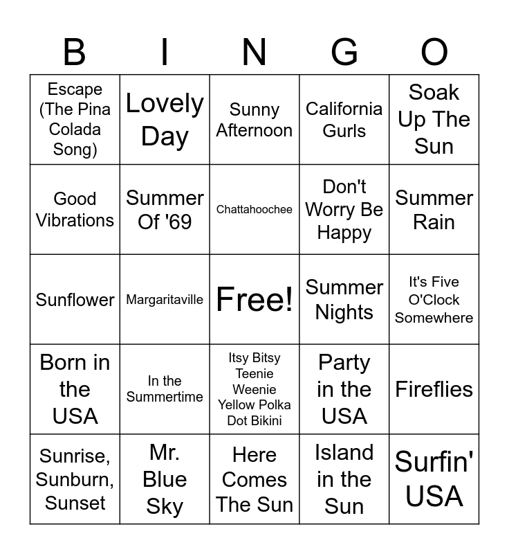 This bingo card has a free space and 50 words: Kokomo, Surfin' USA, Cruisin', Here Comes The Sun, In the Summertime, Vacation, Lovely Day, (Sittin' on) the Dock of the Bay, Good Vibrations, Walking On Sunshine, Summer Of '69, California Gurls, Fireflies, Party in the USA, Pontoon, Some Beach, Chattahoochee, Summer Nights, Summer Breeze, Soak Up The Sun, Margaritaville, Island in the Sun, Escape (The Pina Colada Song), Don't Worry Be Happy, Malibu, In the Sun, Summer Rain, Heat Waves, Sunny Afternoon, Itsy Bitsy Teenie Weenie Yellow Polka Dot Bikini, Everywhere, Summertime Sadness, The Tide Is High, Boondocks, Mr. Blue Sky, Fishin' in the Dark, Take It Easy, Sweet Home Alabama, No Shoes, No Shirt, No Problem, It's Five O'Clock Somewhere, Southern Nights, Drift Away, California Dreamin', I Can See Clearly Now, Sunrise, Sunburn, Sunset, Sunflower, Watermelon Crawl, Watermelon Sugar, Born in the USA and Under the Boardwalk.