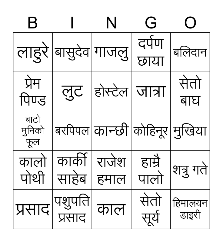 This bingo card has 61 words: Free!, पशुपति प्रसाद, कागबेनी, कालो पोथी, सेतो सूर्य, झोला, लुट, कबड्डी, जात्रा, छक्का पञ्जा, दर्पण छाया, माईती, प्रेम पिण्ड, कुसुमे रुमाल, बसन्ती, लाहुरे, कान्छी, बलिदान, सानो संसार, होस्टेल, कोहिनूर, गाजलु, प्रसाद, शत्रु गते, हाउ फन्नी, घामड शेरे, बिर बिक्रम, जेर्री, सेतो बाघ, मुक्तो, संगम, चिनो, जीवन रेखा, आमा, बासुदेव, टलकजंग भर्सेस टुल्के, नुमाफुङ, बरपिपल, परदेशी, बाटो मुनिको फूल, सुनगाभा, कार्की साहेब, मुखिया, घर, हाम्रै पालो, सिमाना, सपना, परालको आगो, मसान, राजेश हमाल, काल, शीरफूल, ऐश्वर्य, विश्वास, डिग्री माइला, कागजको खोस्टो, झिल्को, उज्यालो, अभिमन्यु, हिमालयन डाइरी and ऐना.