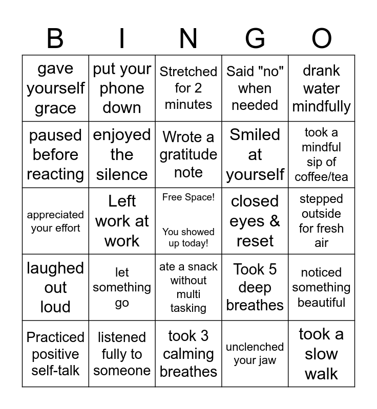 This bingo card has a free space and 24 words: let something go, listened fully to someone, Wrote a gratitude note, Practiced positive self-talk, drank water mindfully, gave yourself grace, paused before reacting, put your phone down, closed eyes & reset, ate a snack without multi tasking, Smiled at yourself, appreciated your effort, Took 5 deep breathes, noticed something beautiful, enjoyed the silence, unclenched your jaw, stepped outside for fresh air, Stretched for 2 minutes, took a mindful sip of coffee/tea, Left work at work, took a slow walk, laughed out loud, Said "no" when needed and took 3 calming breathes.