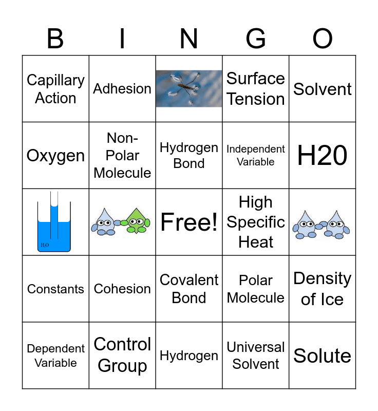 This bingo card has 4 images, a free space and 20 words: Cohesion, Control Group, Hydrogen Bond, Dependent Variable, Solvent, Capillary Action, Oxygen, Adhesion, High Specific Heat, Covalent Bond, Independent Variable, Polar Molecule, Density of Ice, Non-Polar Molecule, Universal Solvent, H20, Solute, Constants, Surface Tension and Hydrogen.