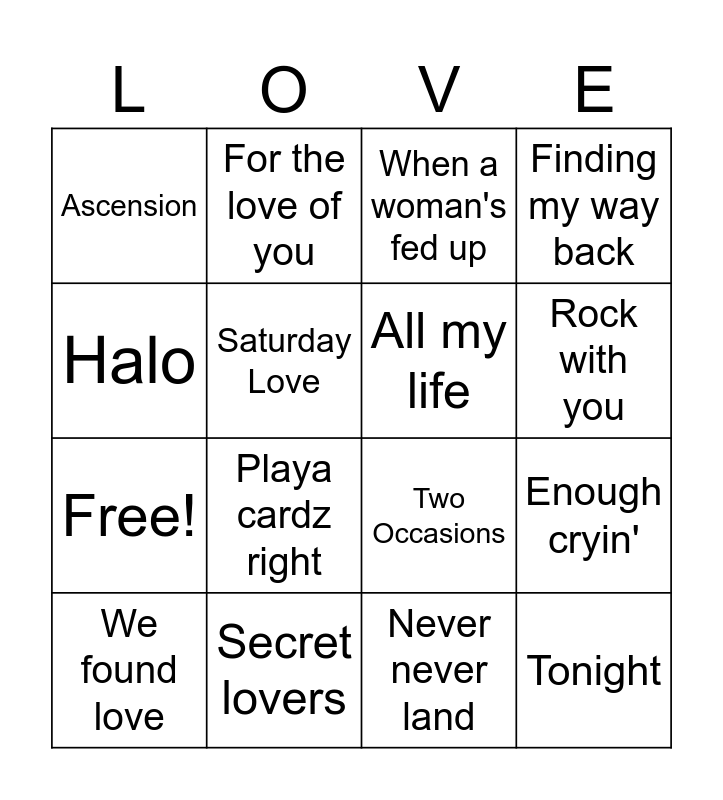 This bingo card has 20 words: We found love, Leave the door open, When a woman's fed up, Enough cryin', Heart on ice, Playa cardz right, Never never land, Finding my way back, Free!, For the love of you, Two Occasions, Rock with you, Ascension, Secret lovers, All my life, Birds of a feather, Halo, Saturday Love, Love yourself and Tonight.