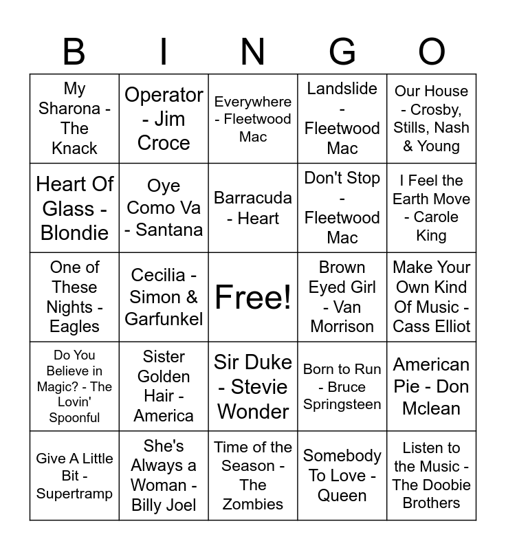 This bingo card has a free space and 83 words: Night Fever - Bee gees, Right Down the Line - Gerry Rafferty, Everywhere - Fleetwood Mac, It Never Rains in Southern California - Albert Hammond, California Dreamin' - The Mamas & The Papas, Could You Be Loved - Bob Marley & The Wailers, Sugar Sugar - The Archies, Love Grows - Edison Lighthouse, Stuck In The Middle With You - Stealers Wheel, Rich Girl - Hall & Oates, Take A Chance On Me - ABBA, Copacabana - Barry Manilow, Oye Como Va - Santana, Brown Eyed Girl - Van Morrison, Voulez-Vous - ABBA, My Sharona - The Knack, Give A Little Bit - Supertramp, Heart Of Glass - Blondie, Dedicated To The One I Love - The Mamas & The Papas, Good Vibrations - The Beach Boys, Don't Go Breaking My Heart - Elton John, Kiki Dee, Don't Stop - Fleetwood Mac, Listen to the Music - The Doobie Brothers, Come On Eileen - Dexys Midnight Runners, Cecilia - Simon & Garfunkel, Go Your Own Way - Fleetwood Mac, Maggie May - Rod Stewart, Reelin' In The Years - Steely Dan, I Saw The Light - Todd Rundgren, Tiny Dancer - Elton John, Sister Golden Hair - America, Take It Easy - Eagles, Mrs. Robinson - Simon & Garfunkel, One of These Nights - Eagles, Layla - Derek & The Dominos, Ventura Highway - America, George Martin, Time of the Season - The Zombies, More Than a Feeling - Boston, I Feel the Earth Move - Carole King, Do You Believe in Magic? - The Lovin' Spoonful, Sunny - Boney M, Daniel - Elton John, Beast Of Burden - The Rolling Stones, You Make Loving Fun - Fleetwood Mac, Old Man - Neil Young, My Sweet Lord - George Harrison, Operator - Jim Croce, Lyin' Eyes - Eagles, Gimme! Gimme! Gimme! - ABBA, September - Earth, Wind & Fire, Born to Run - Bruce Springsteen, Landslide - Fleetwood Mac, Make Your Own Kind Of Music - Cass Elliot, Vienna - Billy Joel, The Chain - Fleetwood Mac, Mamma Mia - ABBA, Young Hearts Run Free - Candi Staton, Bennie And The Jets - Elton John, She's Always a Woman - Billy Joel, "Heroes" - David Bowie, Wuthering Heights - Kate Bush, Starman - David Bowie, Fernando - ABBA, Our House - Crosby, Stills, Nash & Young, My Life - Billy Joel, American Pie - Don Mclean, One Way Or Another - Blondie, More Than A Woman - Bee Gees, It's Too Late - Carole King, Got to Be Real - Cheryl Lynn, Killer Queen - Queen, 50 Ways to Leave Your Lover - Paul Simon, Lovely Day - Bill Withers, Sir Duke - Stevie Wonder, Somebody To Love - Queen, Play That Funky Music - Wild Cherry, This Will Be (An Everlasting Love) - Natalie Cole, Barracuda - Heart, I Want You Back - The Jackson 5, Hotel California - Eagles, Wild World - Yusuf /Cat Stevens, Baba O'Riley - The Who and Rock Lobster - The B-52's.
