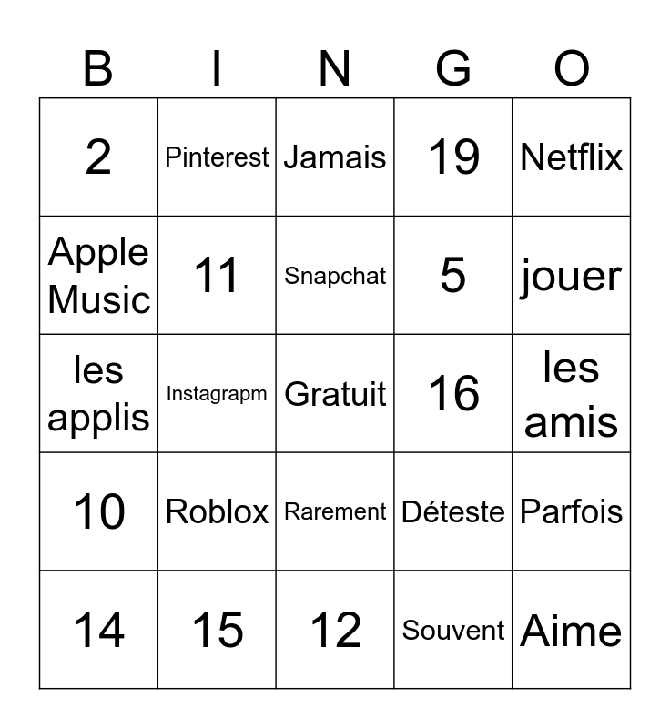 This bingo card has a free space and 42 words: Facebook, Snapchat, Tik Tok, Roblox, Souvent, Parfois, Aime, Adore, Jamais, Rarement, les amis, jouer, Instagrapm, Netflix, Amazon Prime, Déteste, Utilise, les applis, YouTube, Pinterest, Apple Music, Spotify, 1, 2, 3, 4, 5, 6, 7, 8, 9, 10, 11, 12, 13, 14, 15, 16, 17, 18, 19 and 20.