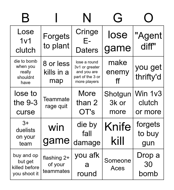 This bingo card has a free space and 24 words: buy and op but get killed before you shoot it, win game, lose a round 3v1 or greater and you are part of the 3 or more players, Someone Aces, "Agent diff", Lose 1v1 clutch, Forgets to plant, Cringe E-Daters, Shotgun 3k or more, Win 1v3 clutch or more, lose to the 9-3 curse, 8 or less kills in a map, Knife kill, forgets to buy gun, die to bomb when you really shouldnt have, flashing 2+ of your teammates, you afk a round, lose game, you get thrifty'd, 3+ duelists on your team, Teammate rage quit, die by fall damage, make enemy ff and Drop a 30 bomb.