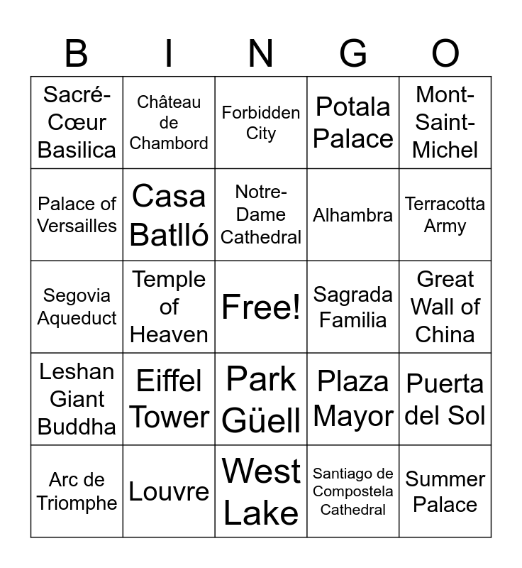 This bingo card has a free space and 24 words: Eiffel Tower, Louvre, Notre-Dame Cathedral, Arc de Triomphe, Mont-Saint-Michel, Sacré-Cœur Basilica, Palace of Versailles, Château de Chambord, Sagrada Familia, Park Güell, Alhambra, Segovia Aqueduct, Plaza Mayor, Puerta del Sol, Casa Batlló, Santiago de Compostela Cathedral, Great Wall of China, Forbidden City, Terracotta Army, Temple of Heaven, Summer Palace, Leshan Giant Buddha, Potala Palace and West Lake.