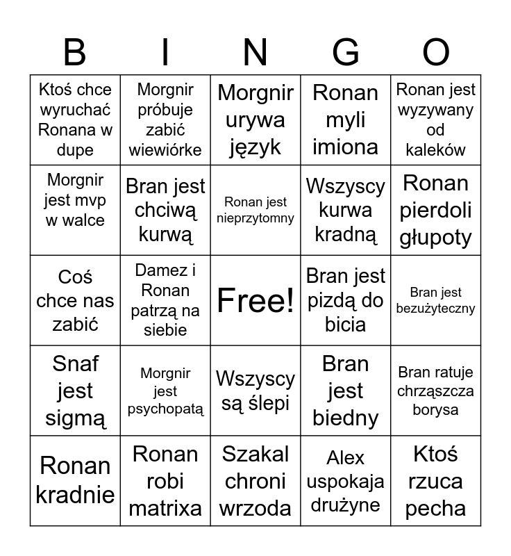 This bingo card has a free space and 24 words: Morgnir jest psychopatą, Ronan robi matrixa, Ronan jest nieprzytomny, Ronan kradnie, Ronan jest wyzywany od kaleków, Ktoś chce wyruchać Ronana w dupe, Morgnir jest mvp w walce, Morgnir próbuje zabić wiewiórke, Bran jest pizdą do bicia, Wszyscy są ślepi, Wszyscy kurwa kradną, Coś chce nas zabić, Bran jest biedny, Bran ratuje chrząszcza borysa, Bran jest chciwą kurwą, Alex uspokaja drużyne, Bran jest bezużyteczny, Morgnir urywa język, Ronan pierdoli głupoty, Damez i Ronan patrzą na siebie, Ktoś rzuca pecha, Snaf jest sigmą, Ronan myli imiona and Szakal chroni wrzoda.