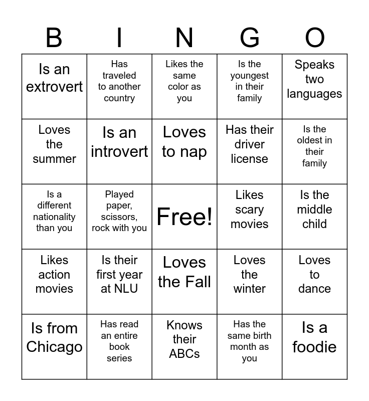 This bingo card has a free space and 24 words: Is their first year at NLU, Has read an entire book series, Loves to nap, Is from Chicago, Speaks two languages, Is an extrovert, Loves the summer, Has traveled to another country, Likes scary movies, Loves the Fall, Has their driver license, Is a different nationality than you, Loves the winter, Loves to dance, Is an introvert, Has the same birth month as you, Is the middle child, Likes the same color as you, Is the oldest in their family, Played paper, scissors, rock with you, Is a foodie, Likes action movies, Is the youngest in their family and Knows their ABCs.