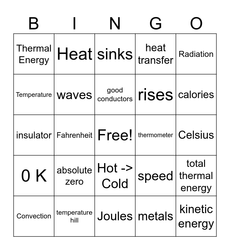 This bingo card has a free space and 24 words: absolute zero, temperature hill, good conductors, Convection, Radiation, Thermal Energy, Temperature, Heat, thermometer, Hot -> Cold, rises, insulator, speed, total thermal energy, waves, metals, Celsius, sinks, calories, Fahrenheit, kinetic energy, 0 K, heat transfer and Joules.