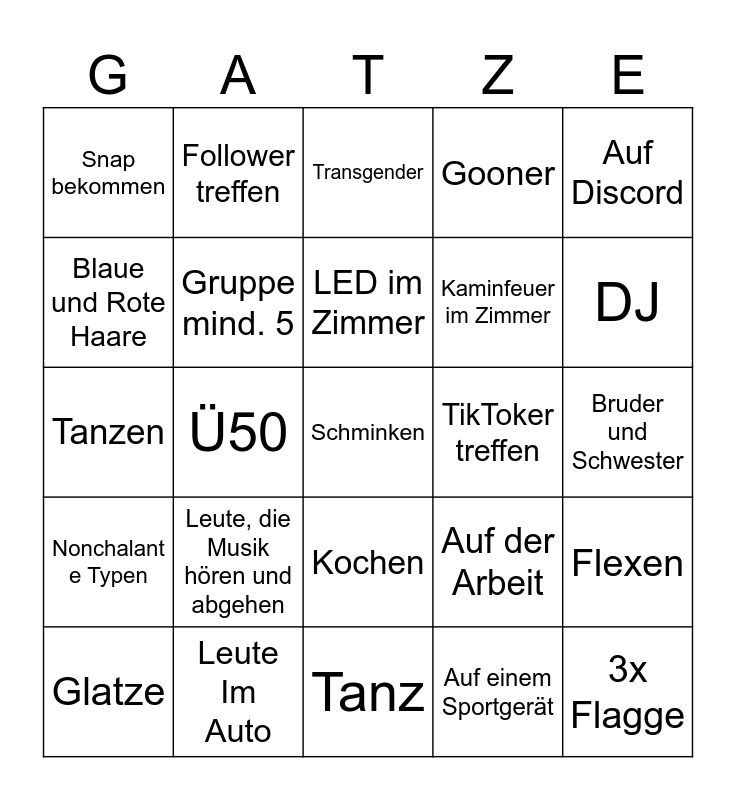 This bingo card has a free space and 24 words: Leute, die Musik hören und abgehen, Leute Im Auto, LED im Zimmer, Glatze, Auf Discord, Snap bekommen, Blaue und Rote Haare, Follower treffen, TikToker treffen, Kochen, Kaminfeuer im Zimmer, Tanzen, Auf der Arbeit, Flexen, Gruppe mind. 5, Auf einem Sportgerät, Bruder und Schwester, Transgender, DJ, Ü50, 3x Flagge, Nonchalant e Typen, Gooner and Tanz.
