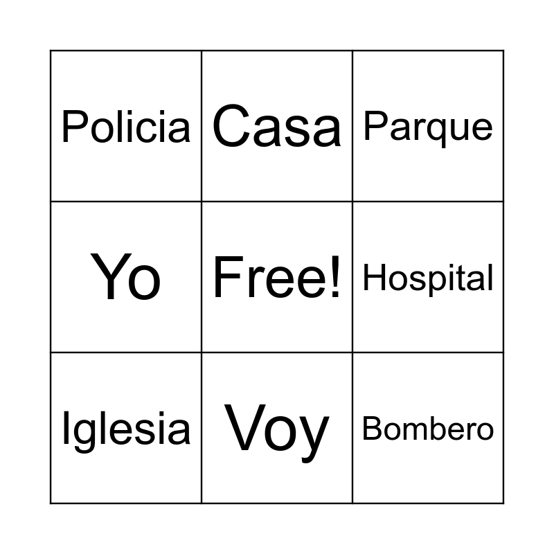 This bingo card has a free space and 8 words: Hospital, Parque, Casa, Iglesia, Policia, Bombero, Yo and Voy.
