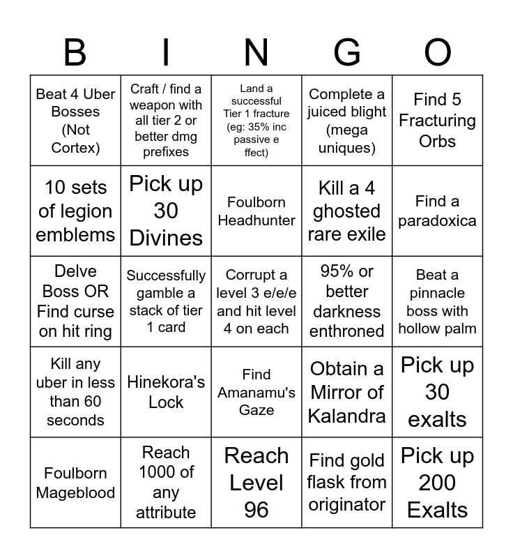 This bingo card has 25 words: Hinekora's Lock, Reach Level 96, Foulborn Headhunter, Foulborn Mageblood, Find 5 Fracturing Orbs, Beat 4 Uber Bosses (Not Cortex), 10 sets of legion emblems, Craft / find a weapon with all tier 2 or better dmg prefixes, 95% or better darkness enthroned, Find Amanamu's Gaze, Kill a 4 ghosted rare exile, Delve Boss OR Find curse on hit ring, Obtain a Mirror of Kalandra, Pick up 30 exalts, Pick up 30 Divines, Pick up 200 Exalts, Beat a pinnacle boss with hollow palm, Land a successful Tier 1 fracture (eg: 35% inc passive effect), Find a paradoxica, Successfully gamble a stack of tier 1 card, Corrupt a level 3 e/e/e and hit level 4 on each, Reach 1000 of any attribute, Kill any uber in less than 60 seconds, Complete a juiced blight (mega uniques) and Find gold flask from originator.