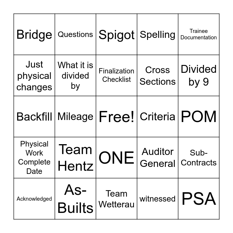 This bingo card has a free space and 138 words: Finals Unit, District 5, PennDOT, Construction, Golden Pencil Award, Criteria, Documentation, Audit Notes, Auditor Review, ECMS, Audit Noted, Auditor, Work Order, Authorizations, Work Order Explanations, Force Account, POM, 408, Bulletin Board, Fringe Benefit Letter, EO-365, Sub-Contracts, Team Wetterau, Team Myers, Team Dalia, Team Hentz, Pine Grove, Minersville, Tannersville, Morgantown, PSA, Quick Calcs, Men & equipment, witnessed, Attachment’s, Item number, Sketch, Calculation, Date work was done, Date of payment, Payment amount visible, Legible entries, Spreadsheets, Rounding, Bell, Spigot, IPAD, Computer requests, Project Closeout, Final Inspection Punchlist, Semi Final Inspection Punchlist, Physical Work Complete Date, Final DBE Payment, Quality Survey for Design, Contractor Evaluations, Finalization Checklist, IIC, Final Inspection Date, Acceptance Certificate, Interest, After Action Review, As-Builts, Contractor, Notification of Final Quantities, Contract, Prime, Construction Mitigation, Tab sheets, Just physical changes, Correction, Design Build, Designer, Project staff, Design consultant, PDF, Scanning, Truck, Weather, Mileage, Lunch, Safety Equipment, Utilities, Thank You, Questions, Traffic cone, Orange, Paint, Feds, Auditor General, Calendar Year, Feet & Inches, Referenced, Timely Manner, Acknowledged, Spelling, Grammatical, Rejected, Prompt, ONE, Guidelines, TWO, THREE, Trainee Documentation, 10 days, One Full Set, Boxed up correctly, Nominees, Green Hills Road, 2025, 2023, What Columns are being calculated, What it is divided by, Measurements, Square yards, Cubic yards, Show your divisor, Divided by 9, Divided by 27, subgrade, base course, asphalt, concrete, median, Right of way, Backfill, Binder course, Cross Sections, Shoulder, Culvert, Bituminous, Rehabilitation, Reconstruction, Excavation, Bridge, Road, Detour, Drainage and Structure.