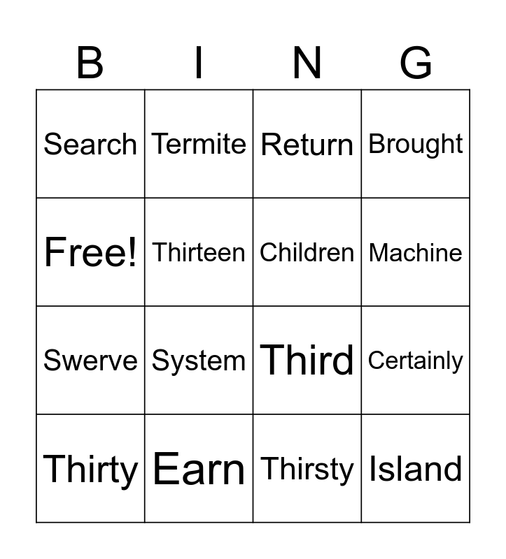 This bingo card has 16 words: Earn, Certainly, Return, Search, Swerve, Termite, Third, Thirsty, Free!, Thirteen, Thirty, Brought, System, Machine, Children and Island.