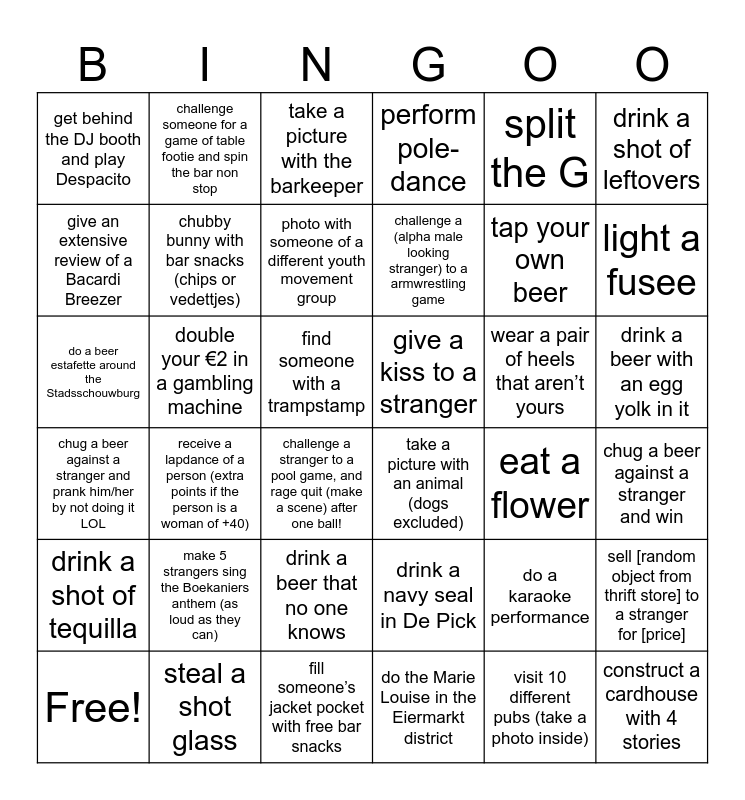 This bingo card has 37 words: Free!, drink a shot of tequilla, steal a shot glass, take a picture with the barkeeper, give a kiss to a stranger, eat a flower, drink a shot of leftovers, shoot a bullseye (record the throw), double your €2 in a gambling machine, drink a beer that no one knows, perform pole-dance, tap your own beer, light a fusee, give an extensive review of a Bacardi Breezer, receive a lapdance of a person (extra points if the person is a woman of +40), find someone with a trampstamp, drink a navy seal in De Pick, split the G, drink a beer with an egg yolk in it, get behind the DJ booth and play Despacito, challenge someone for a game of table footie and spin the bar non stop, photo with someone of a different youth movement group, take a picture with an animal (dogs excluded), do a karaoke performance, chug a beer against a stranger and win, chug a beer against a stranger and prank him/her by not doing it LOL, chubby bunny with bar snacks (chips or vedettjes), fill someone’s jacket pocket with free bar snacks, do the Marie Louise in the Eiermarkt district, visit 10 different pubs (take a photo inside), construct a cardhouse with 4 stories, do a beer estafette around the Stadsschouwburg, make 5 strangers sing the Boekaniers anthem (as loud as they can), challenge a stranger to a pool game, and rage quit (make a scene) after one ball!, challenge a (alpha male looking stranger) to a armwrestling game, wear a pair of heels that aren’t yours and sell [random object from thrift store] to a stranger for [price].