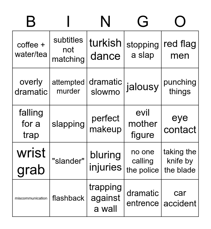 This bingo card has a free space and 24 words: "slander", flashback, dramatic slowmo, miscommunication, red flag men, coffee + water/tea, overly dramatic, subtitles not matching, evil mother figure, bluring injuries, jalousy, falling for a trap, no one calling the police, taking the knife by the blade, attempted murder, dramatic entrence, eye contact, turkish dance, punching things, slapping, car accident, wrist grab, stopping a slap and trapping against a wall.