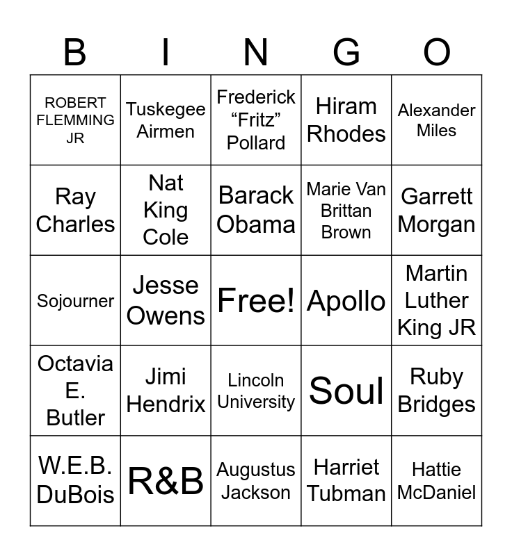 This bingo card has a free space and 24 words: W.E.B. DuBois, Jimi Hendrix, Barack Obama, Harriet Tubman, Alexander Miles, ROBERT FLEMMING JR, Tuskegee Airmen, Frederick “Fritz” Pollard, Apollo, Martin Luther King JR, Sojourner, Nat King Cole, Soul, Ruby Bridges, Ray Charles, R&B, Augustus Jackson, Hiram Rhodes, Garrett Morgan, Octavia E. Butler, Jesse Owens, Lincoln University, Marie Van Brittan Brown and Hattie McDaniel.