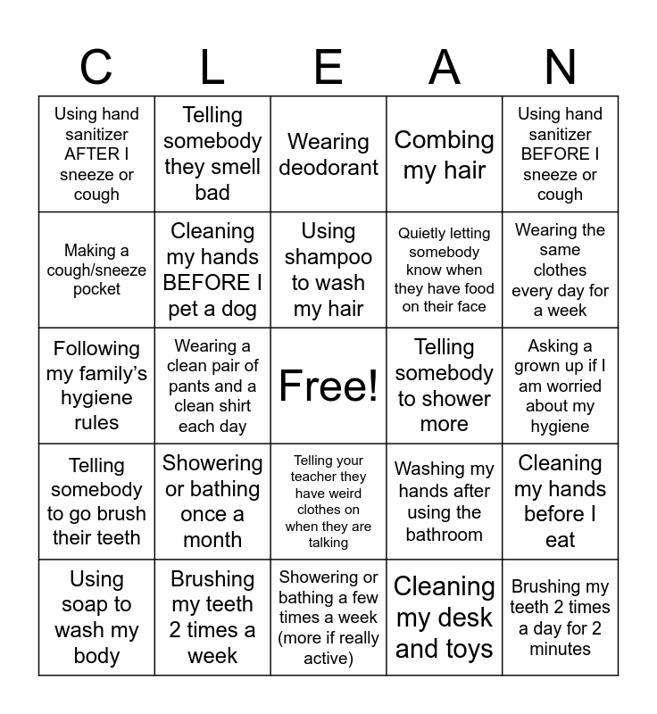 This bingo card has a free space and 25 words: Showering or bathing once a month, Showering or bathing a few times a week (more if really active), Using shampoo to wash my hair, Using soap to wash my body, Using hand sanitizer BEFORE I sneeze or cough, Using hand sanitizer AFTER I sneeze or cough, Making a cough/sneeze pocket, Telling somebody they smell bad, Telling somebody to shower more, Telling your teacher they have weird clothes on when they are talking, Quietly letting somebody know when they have food on their face, Following my family’s hygiene rules, Washing my hands after using the bathroom, Cleaning my hands before I eat, Cleaning my hands BEFORE I pet a dog, Cleaning under my nails or keeping them short, Asking a grown up if I am worried about my hygiene, Wearing deodorant, Wearing the same clothes every day for a week, Wearing a clean pair of pants and a clean shirt each day, Brushing my teeth 2 times a day for 2 minutes, Brushing my teeth 2 times a week, Telling somebody to go brush their teeth, Combing my hair and Cleaning my desk and toys.