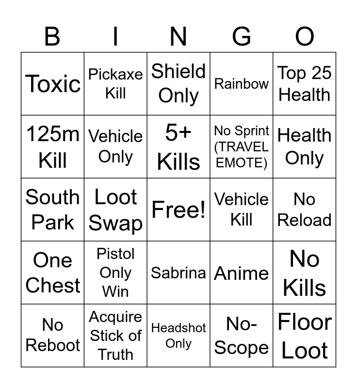 This bingo card has a free space and 24 words: Pistol Only Win, Acquire Stick of Truth, 5+ Kills, No Reboot, Top 25 Health, Toxic, 125m Kill, Pickaxe Kill, Vehicle Kill, Sabrina, No Sprint (TRAVEL EMOTE), South Park, Anime, No Kills, Vehicle Only, No-Scope, No Reload, Shield Only, Health Only, Loot Swap, Floor Loot, One Chest, Rainbow and Headshot Only.