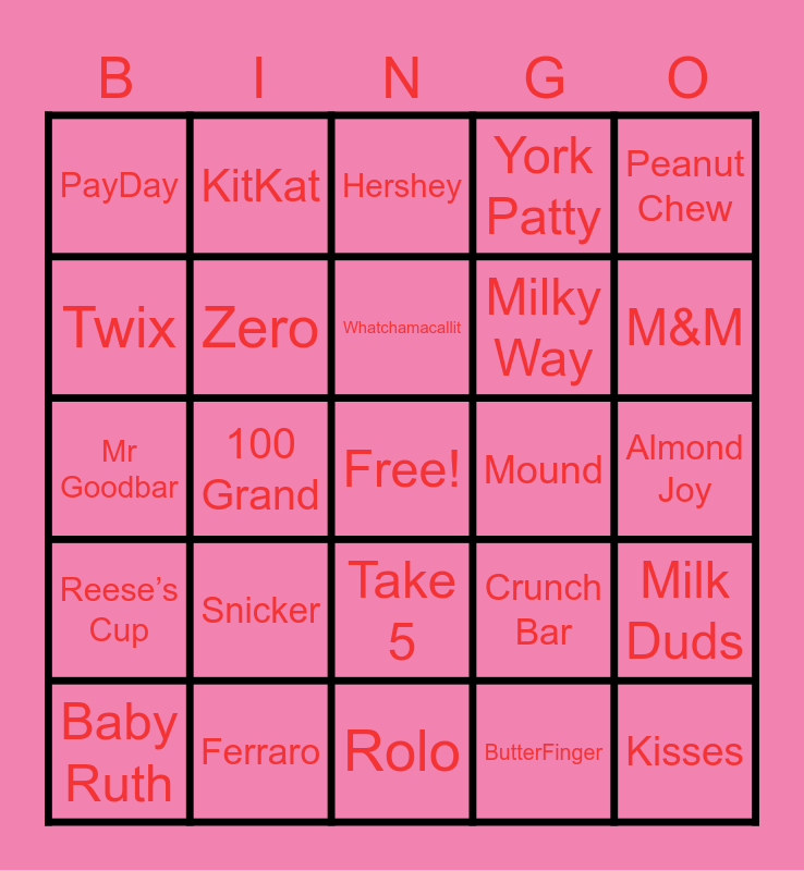 This bingo card has a free space and 24 words: Snicker, Ferraro, Whatchamacallit, Baby Ruth, Peanut Chew, PayDay, Twix, KitKat, Mound, Take 5, Milky Way, Mr Goodbar, Crunch Bar, Milk Duds, Zero, ButterFinger, Almond Joy, Hershey, M&M, 100 Grand, Kisses, Reese’s Cup, York Patty and Rolo.