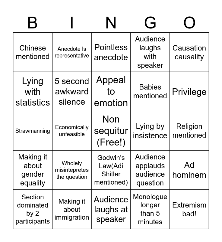 This bingo card has a free space and 24 words: Wholely misintepretes the question, Making it about immigration, Appeal to emotion, Section dominated by 2 participants, Causation causality, Chinese mentioned, Lying with statistics, Anecdote Is representative, Lying by insistence, Godwin’s Law(Adi Shitler mentioned), Babies mentioned, Strawmanning, Audience applauds audience question, Ad hominem, 5 second awkward silence, Monologue longer than 5 minutes, Religion mentioned, Pointless anecdote, Privilege, Economically unfeasible, Extremism bad!, Making it about gender equality, Audience laughs with speaker and Audience laughs at speaker.