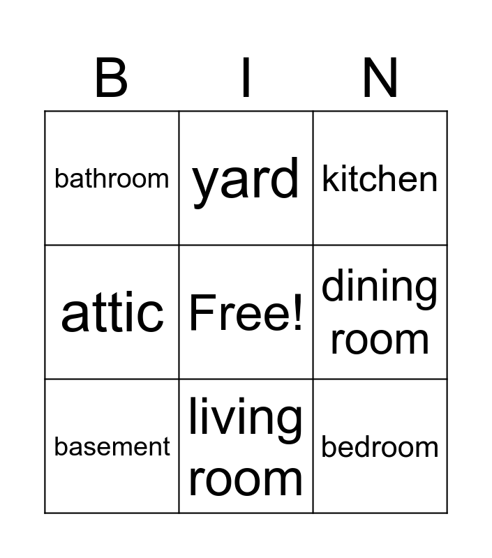 This bingo card has a free space and 10 words: living room, kitchen, bathroom, bedroom, attic, basement, yard, garage, dining room and house.