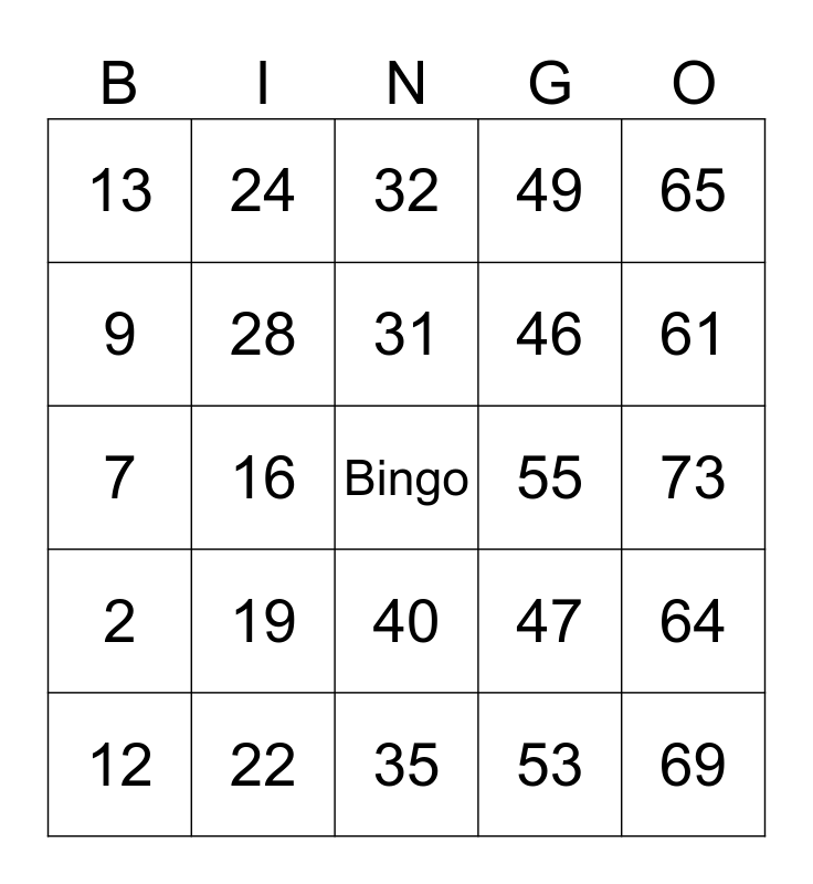 This bingo card has a free space and 24 words: 12, 19, 31, 53, 65, 13, 24, 32, 55, 73, 7, 28, 47, 64, 9, 22, 35, 49, 61, 2, 16, 40, 46 and 69.