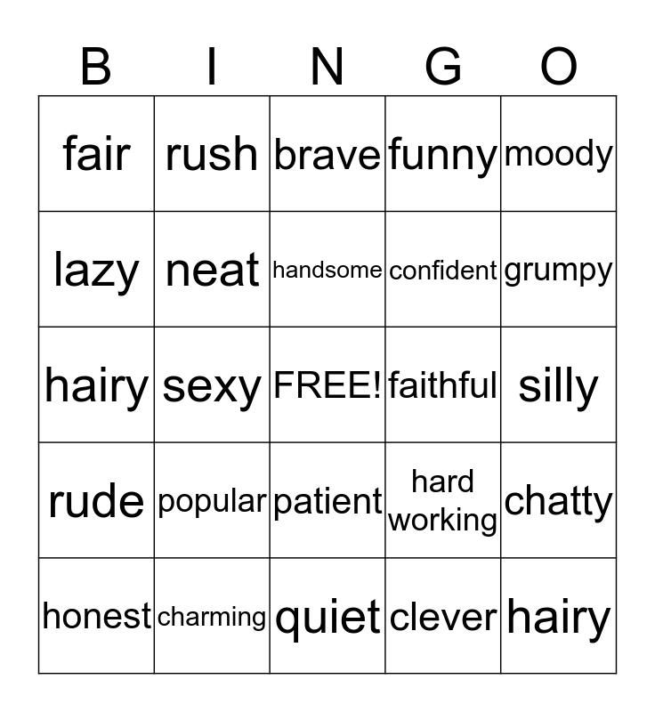 This bingo card has a free space and 24 words: popular, charming, handsome, honest, moody, fair, lazy, rush, faithful, patient, confident, hairy, hard working, chatty, neat, clever, silly, brave, grumpy, sexy, hairy, rude, funny and quiet.