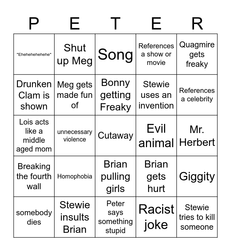 This bingo card has a free space and 24 words: Homophobia, Stewie insults Brian, Bonny getting Freaky, somebody dies, Quagmire gets freaky, "Ehehehehehehe", Drunken Clam is shown, Shut up Meg, Evil animal, Brian pulling girls, Stewie uses an invention, Lois acts like a middle aged mom, Brian gets hurt, Giggity, Meg gets made fun of, Racist joke, Mr. Herbert, Song, References a celebrity, unnecessary violence, Stewie tries to kill someone, Breaking the fourth wall, References a show or movie and Peter says something stupid.