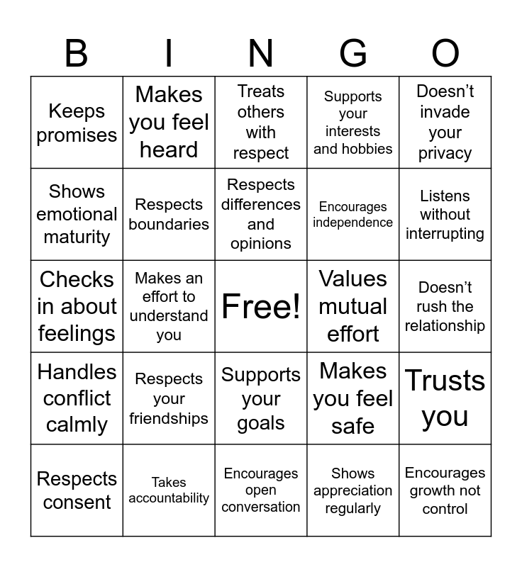 This bingo card has a free space and 31 words: Encourages open conversation, Respects your opinions, Makes an effort to understand you, Supports your mental health, Keeps promises, Treats others with respect, Respects boundaries, Makes you feel safe, Values mutual effort, Shows appreciation regularly, Doesn’t rush the relationship, Encourages growth not control, Communicates honestly, Respects your time, Listens without interrupting, Celebrates your achievements, Trusts you, Respects your friendships, Handles conflict calmly, Supports your goals, Doesn’t invade your privacy, Treats you with kindness, Respects consent, Makes you feel heard, Encourages independence, Shows emotional maturity, Supports your interests and hobbies, Checks in about feelings, Takes accountability, Respects differences and opinions and Makes you feel valued.