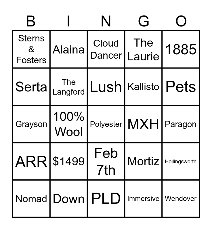 This bingo card has 25 words: $1499, PLD, Lush, Nomad, 1885, Sterns & Fosters, Serta, Alaina, MXH, Feb 7th, Kallisto, Grayson, Mortiz, Hollingsworth, The Langford, Wendover, Paragon, Cloud Dancer, Pets, 100% Wool, Polyester, Down, ARR, The Laurie and Immersive.