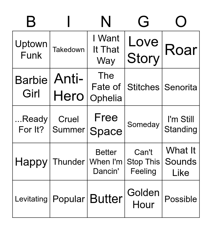 This bingo card has a free space and 63 words: Soda Pop, Your Idol, Brainrot Rap, What It Sounds Like, Golden, Free, Takedown, Try Everything, The Fate of Ophelia, APT., Better When I'm Dancin', Pink Pony Club, I'm Still Standing, Roar, I Knew You Were Trouble, Barbie Girl, Cruel Summer, Uptown Funk, You Belong With Me, Stitches, Thunder, Happy, Love Story, All Star, This is Me, Sunflower, The Greatest Show, Happier, Sunroof, Look What You Made Me Do, Yeah!, This is What You Came For, Die With a Smile, Don't Start Now, Senorita, Levitating, Heat Waves, Golden Hour, Havana, Anti-Hero, ...Ready For It?, Someday, We Own the Night, Kerosene, Possible, Popular, We Don't Talk About Bruno, Can't Stop This Feeling, Chillin' Like A Villian, Rotten to the Core, A Sky Full of Stars, Butter, Let It Go, I Just Can't Wait to Be King, Into the Unknown, I Want It That Way, Can't Stop the Feeling, Me!, Footloose, Ordinary, Rain on Me, Kings & Queens and Dance Monkey.