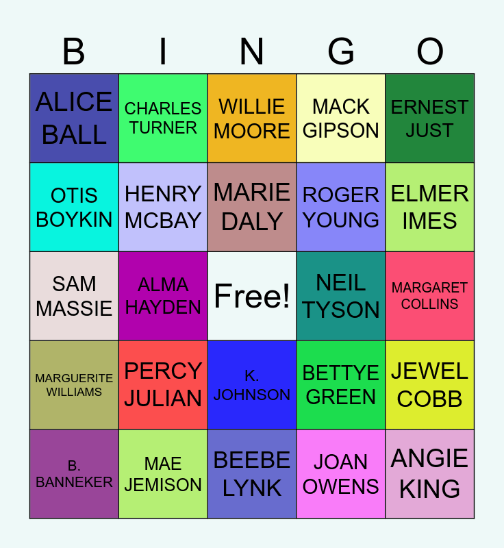 This bingo card has a free space and 24 words: PERCY JULIAN, MAE JEMISON, MARIE DALY, B. BANNEKER, ERNEST JUST, ALICE BALL, OTIS BOYKIN, CHARLES TURNER, NEIL TYSON, K. JOHNSON, ROGER YOUNG, SAM MASSIE, BETTYE GREEN, JEWEL COBB, HENRY MCBAY, JOAN OWENS, MARGARET COLLINS, WILLIE MOORE, ELMER IMES, ALMA HAYDEN, ANGIE KING, MARGUERITE WILLIAMS, MACK GIPSON and BEEBE LYNK.