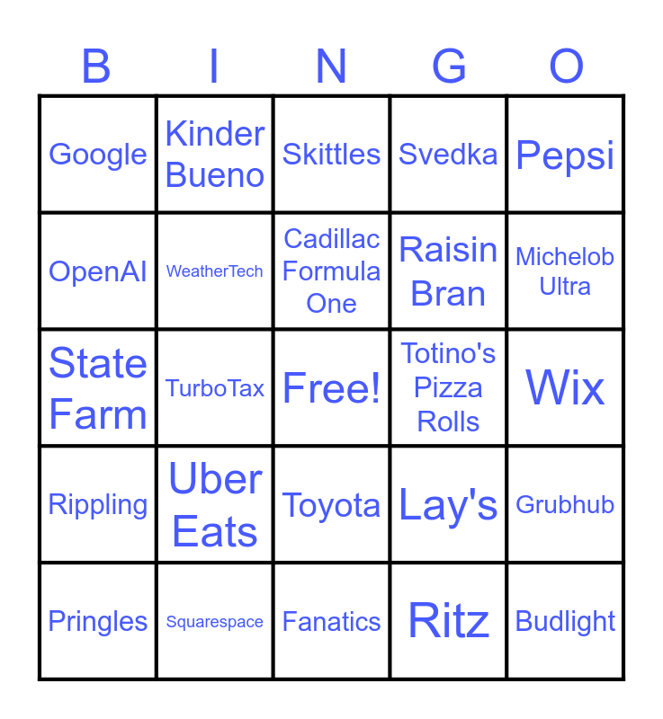 This bingo card has a free space and 44 words: Budweiser, Budlight, Oikos, Pringles, Ramp, Ritz, Skittles, Doritos, Pepsi, Squarespace, Svedka, Totino's Pizza Rolls, Toyota, Uber Eats, Instacart, Fanatics, Novartis, State Farm, Bosch, Michelob Ultra, Kinder Bueno, Avocados from Mexico, Wonderful Pistachios, Google, Hims, Wix, Boehringer Ingelheim, Ro, Lay's, Rippling, Rocket Mortgage, Grubhub, Liquid I.V., Meta, TurboTax, Liquid Death, Manscaped, Salesforce, Cadillac Formula One, OpenAI, Raisin Bran, Dove, WeatherTech and Homes.com.