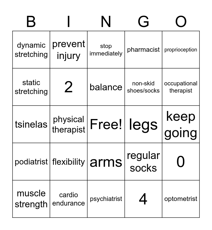 This bingo card has a free space and 24 words: flexibility, cardio endurance, balance, muscle strength, proprioception, dynamic stretching, static stretching, prevent injury, legs, arms, non-skid shoes/socks, tsinelas, regular socks, 0, 2, 4, keep going, stop immediately, occupational therapist, physical therapist, optometrist, podiatrist, pharmacist and psychiatrist.